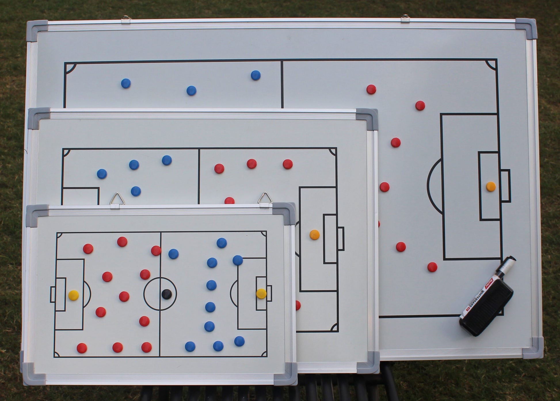 Lavagna rigida magnetica riscrivibile, con stampa del campo di gioco fornita di magneti rossi, blu e pennarello.